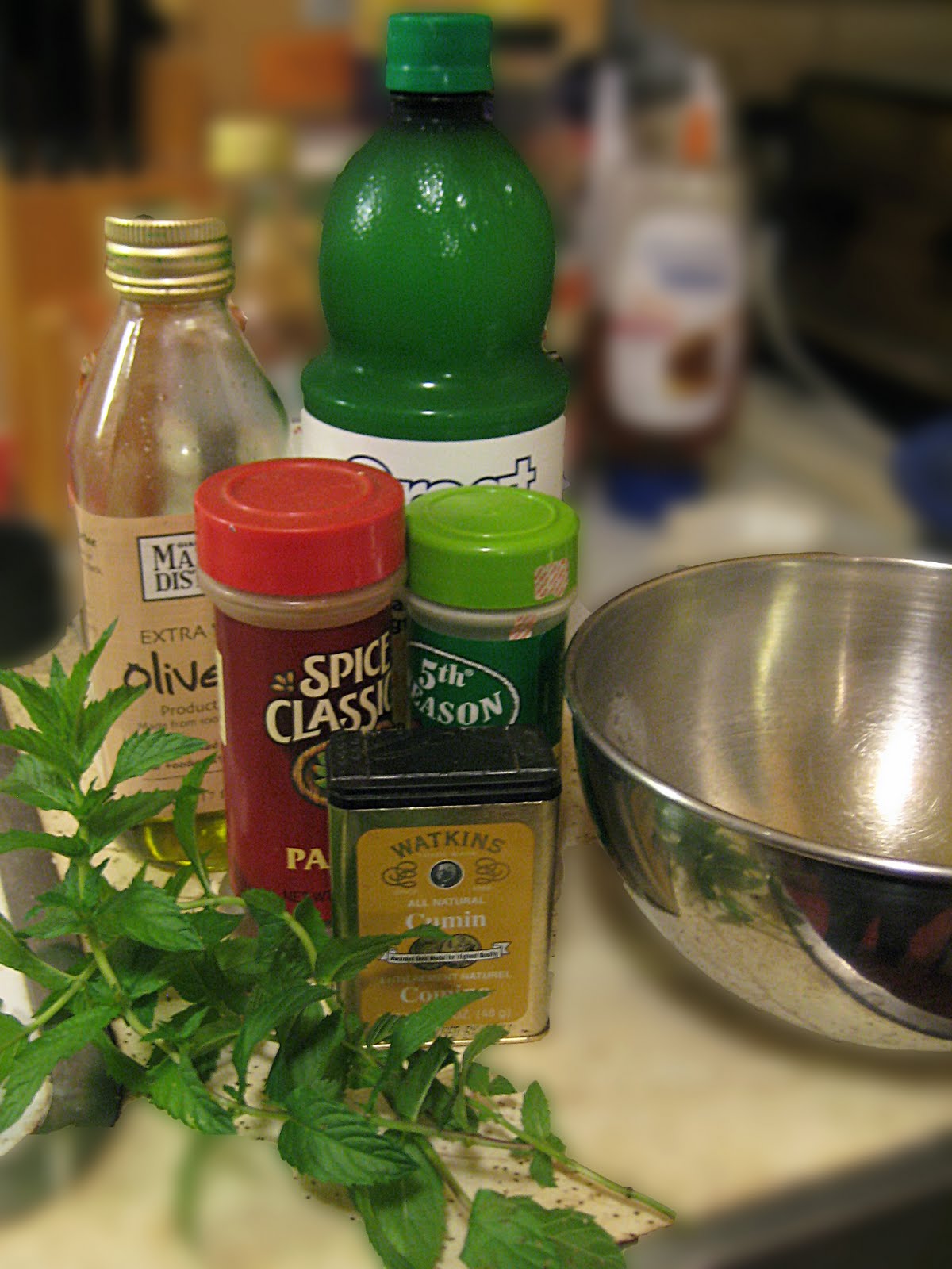 1. In a medium bowl, mix together the lemon juice, olive oil, half a sprig of the mint, garlic, paprika, and cumin. Pierce thawed chicken breast with a knife all over and let sit in marinade for 10 minutes.